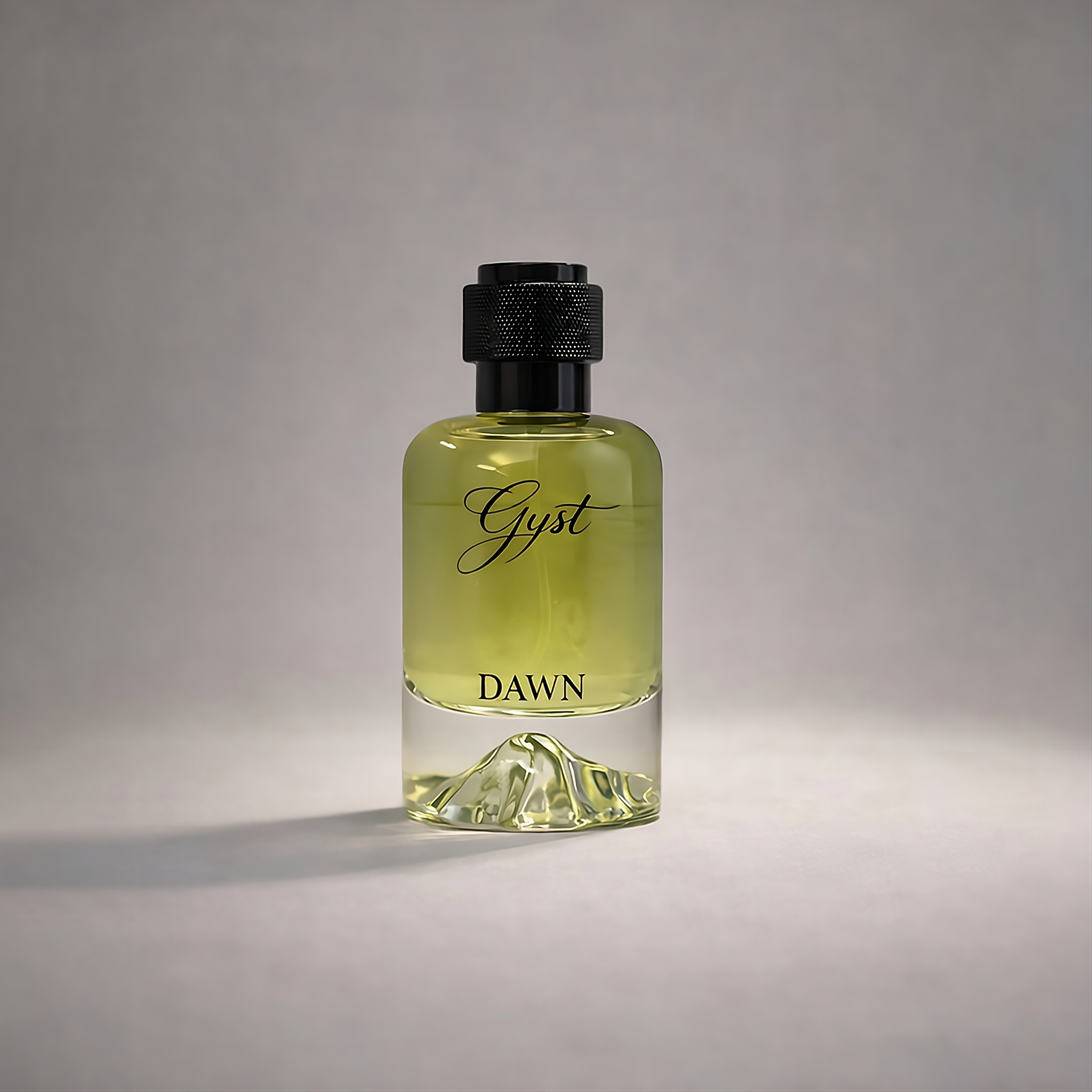 Minimalism meets monumental design. The DAWN bottle features clean, architectural lines topped with a tactile, matte-black cap. Suspended within the heavy, crystal-clear glass base is a striking silver mountain peak—a physical manifestation of the fragrance’s grounded nature and elevated spirit.